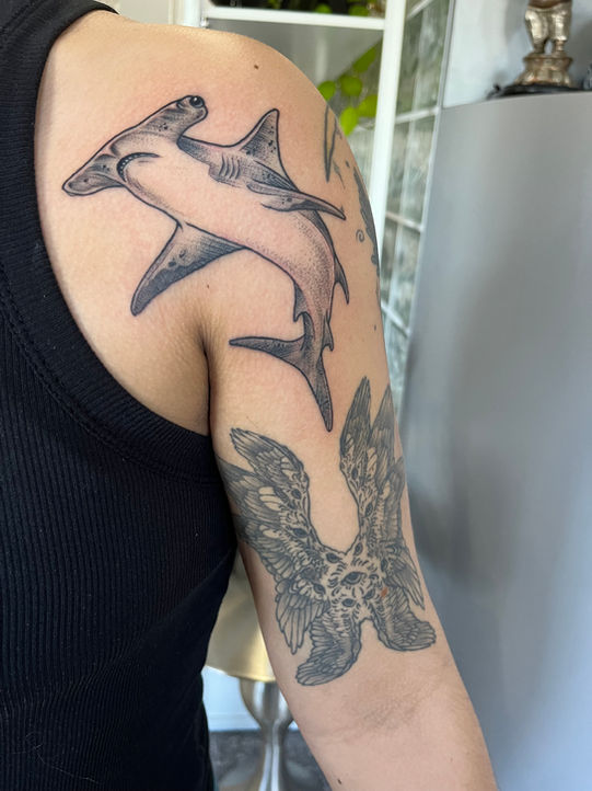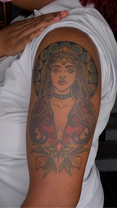 An ever-curious Gemini by nature, she has varied artistic interests and has studied everything from writing and literature, to music history and ballet, to fine art and art history. In traditional art, her favorite subject is human figure drawing and portraiture, working primarily in dry mediums like charcoal, graphite, conté crayons, and pastels. However, her tattoo style is more encompassing of Illustrative, Traditional & Neo-traditional art styles. She enjoys doing line work, including bold and fine line, as well as color, blackwork, and black & gray tattoos. She is just as happy to do tiny tattoos as larger pieces. She is most inspired by Victorian and Edwardian themes, Art Nouveau and Art Deco, and is partial to organic and asymmetrical forms (super mathematical geometric art and photo-realism tattoos make this air sign feel trapped—help!). She also loves flowers, animal and pet tattoos, mermaids, pinups, classic art and literature themes, and she truly enjoys doing sentimental pieces such as handwriting from a loved one (those are actually her favorite kind of tattoos to do for people). She is partial to weird and quirky or humorous tattoos, so send those ideas over, too!